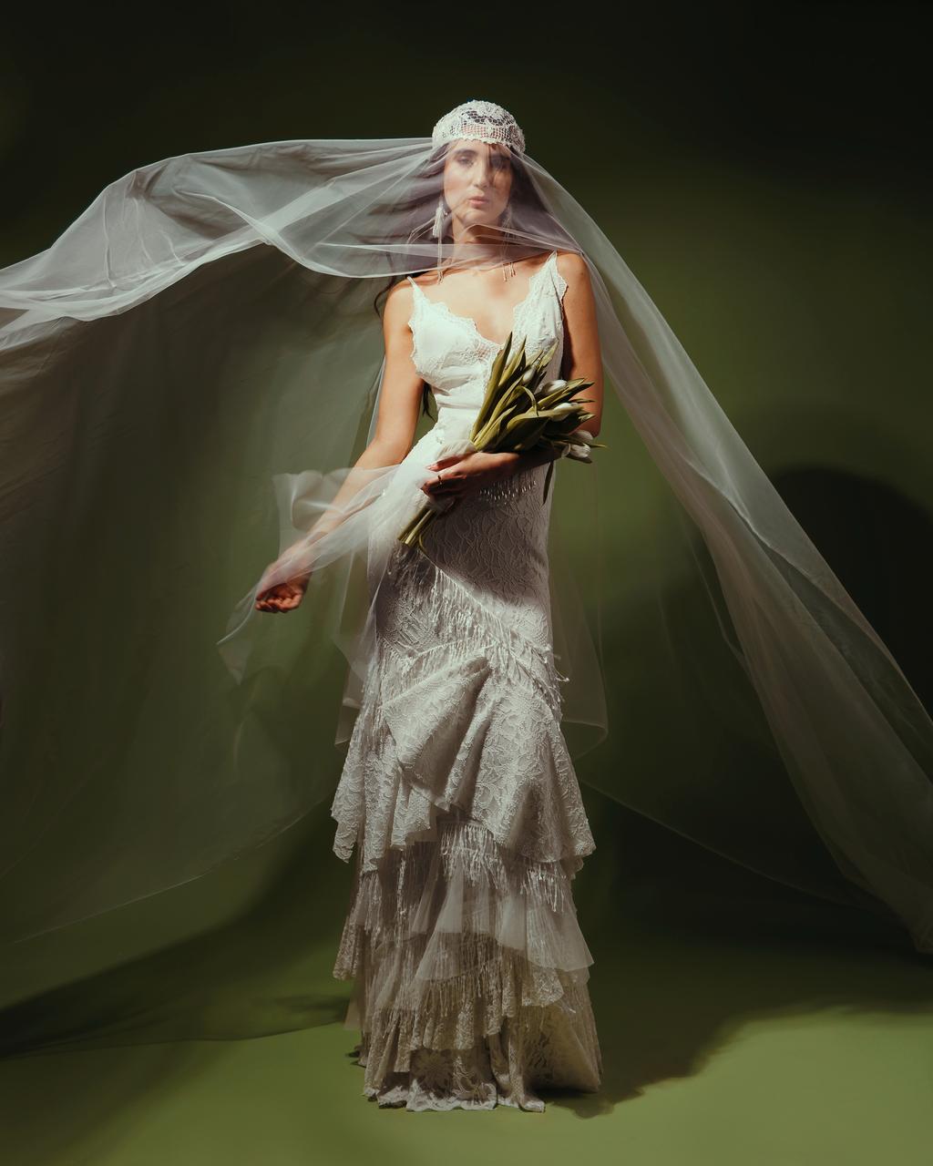 Cada pieza está hecha a mano con materiales nobles como encaje chantillí, nácar, perlas de río, tul, sedas y bordados artesanales.