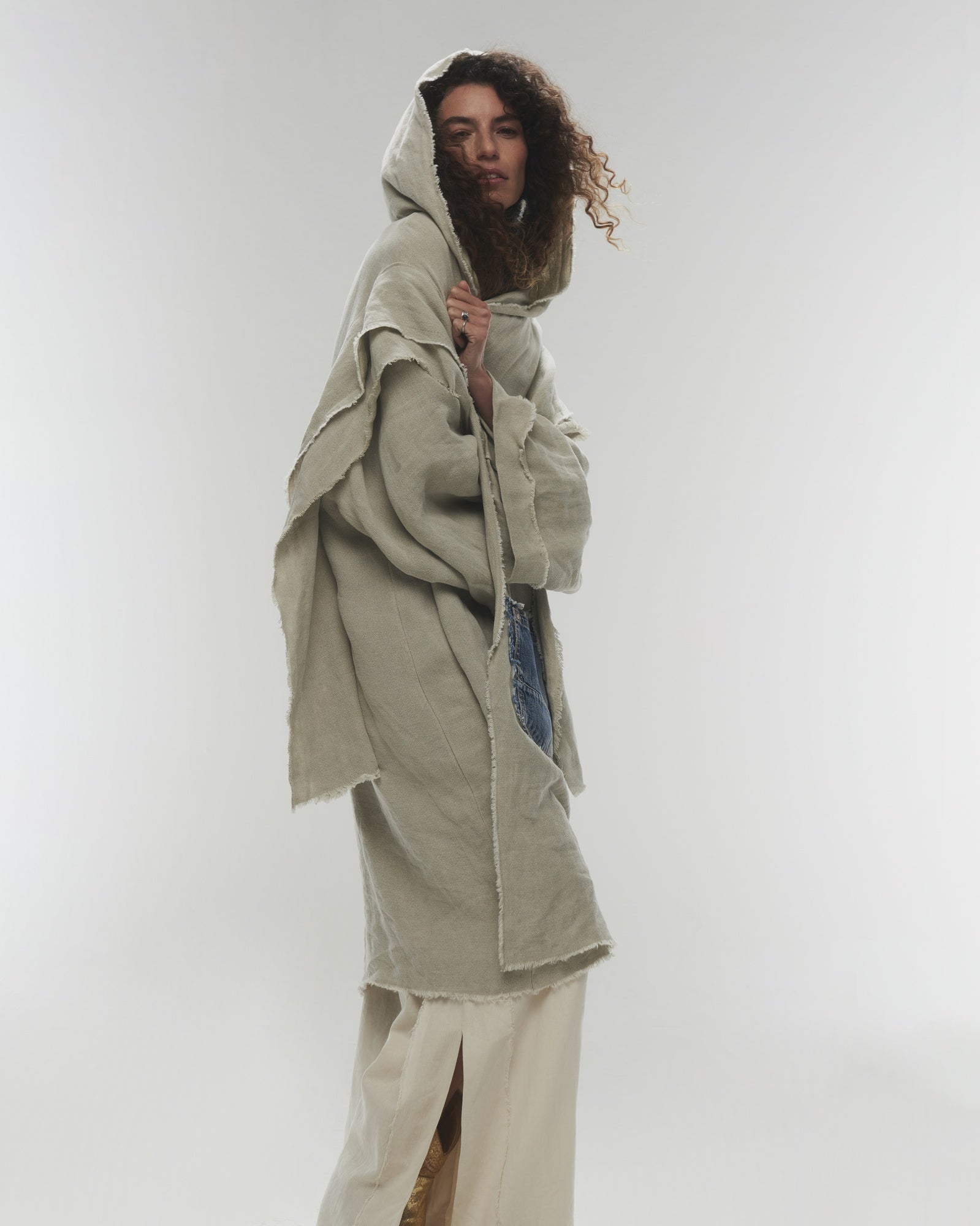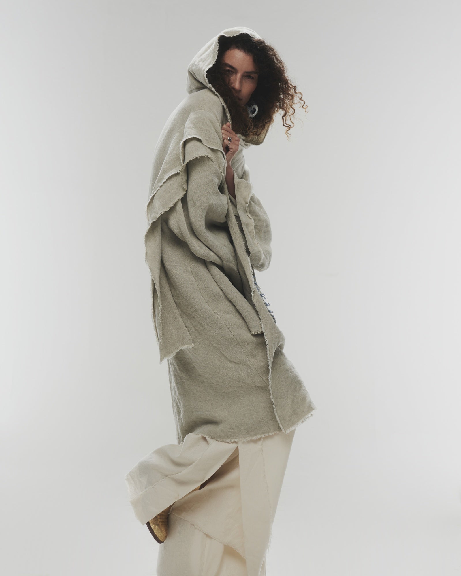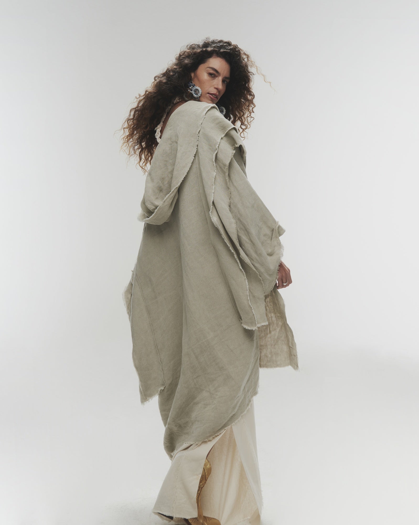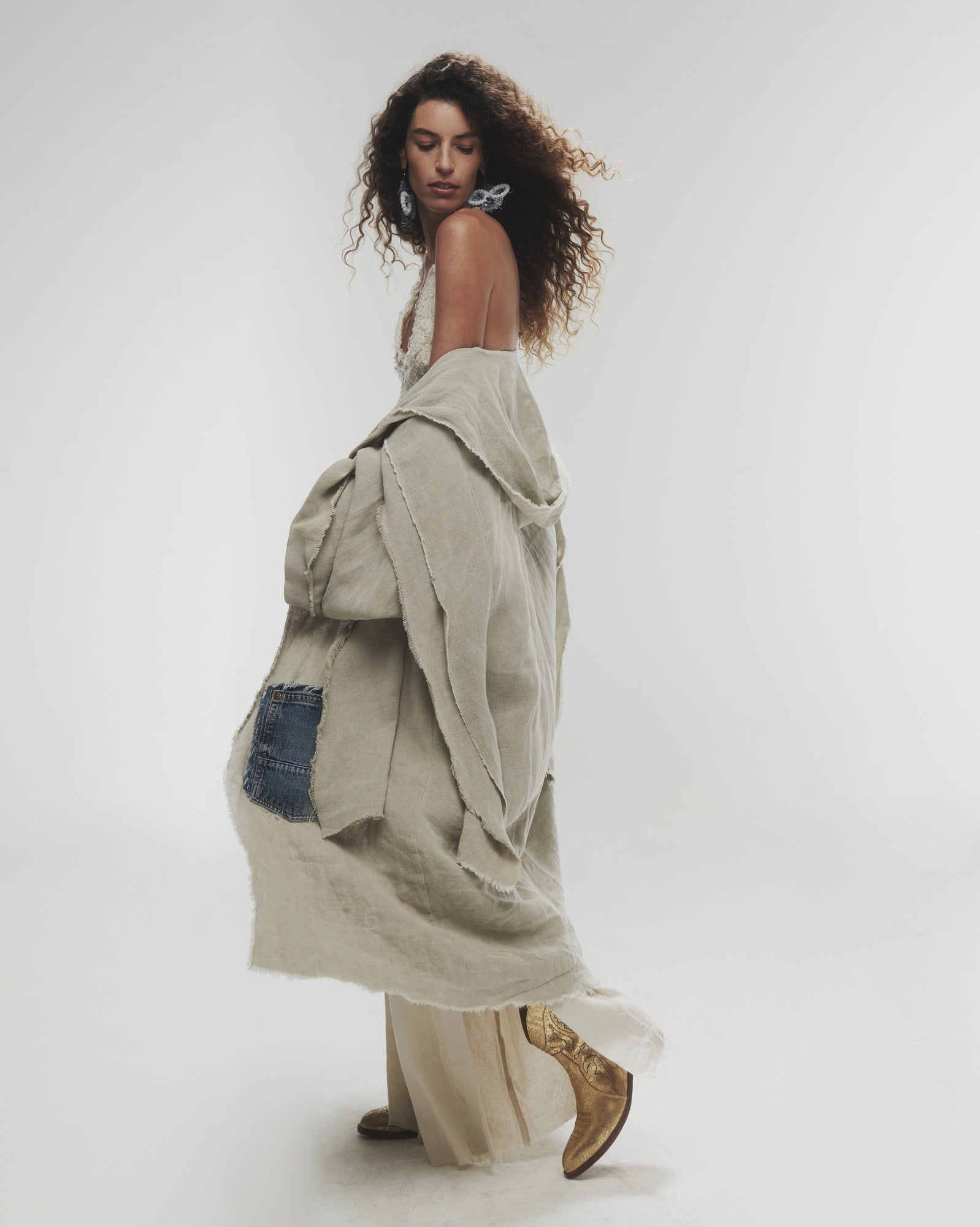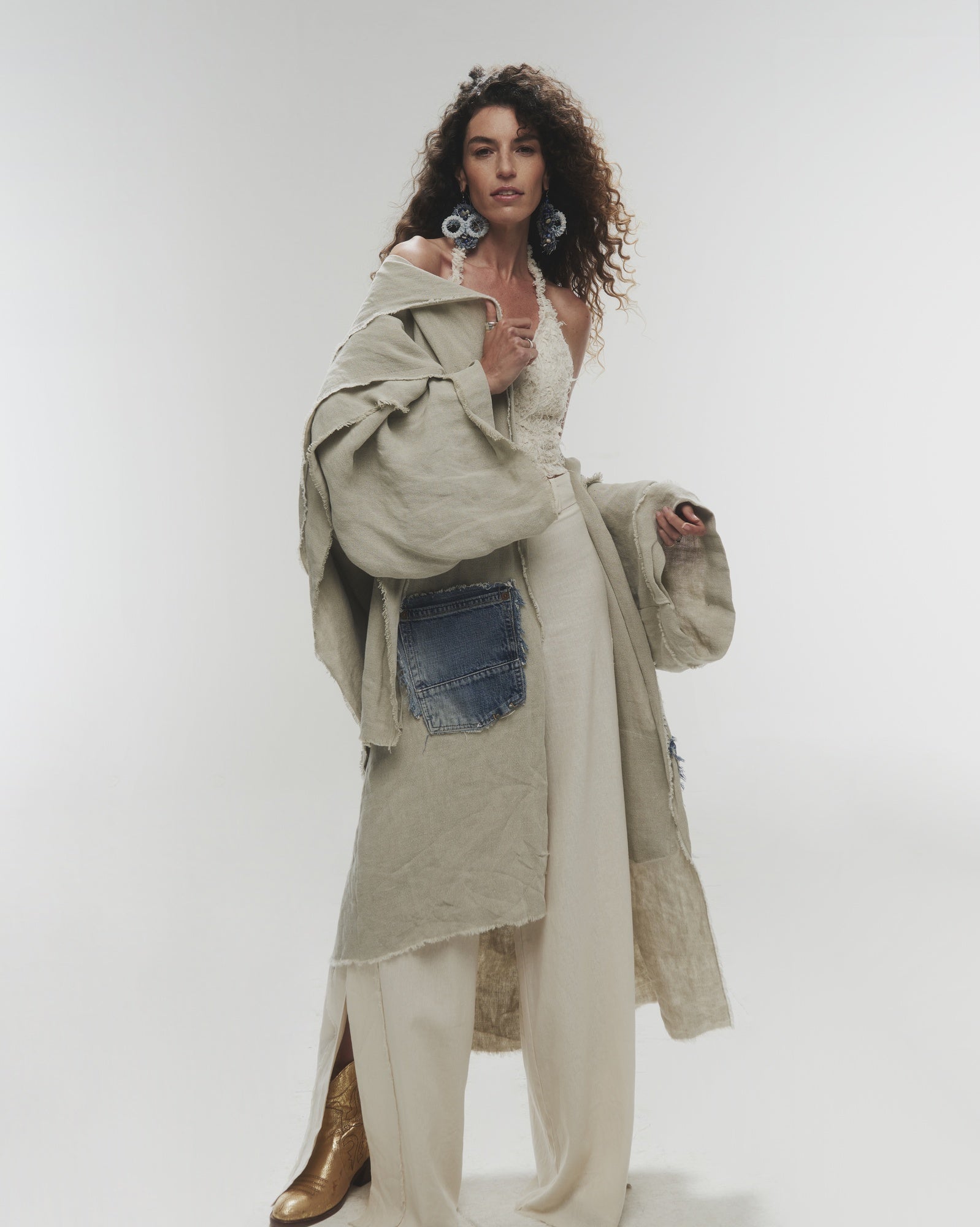 Abrigo tipo saco de lino, con bolsillos confeccionados en denim reciclado mediante técnica de upcycling.