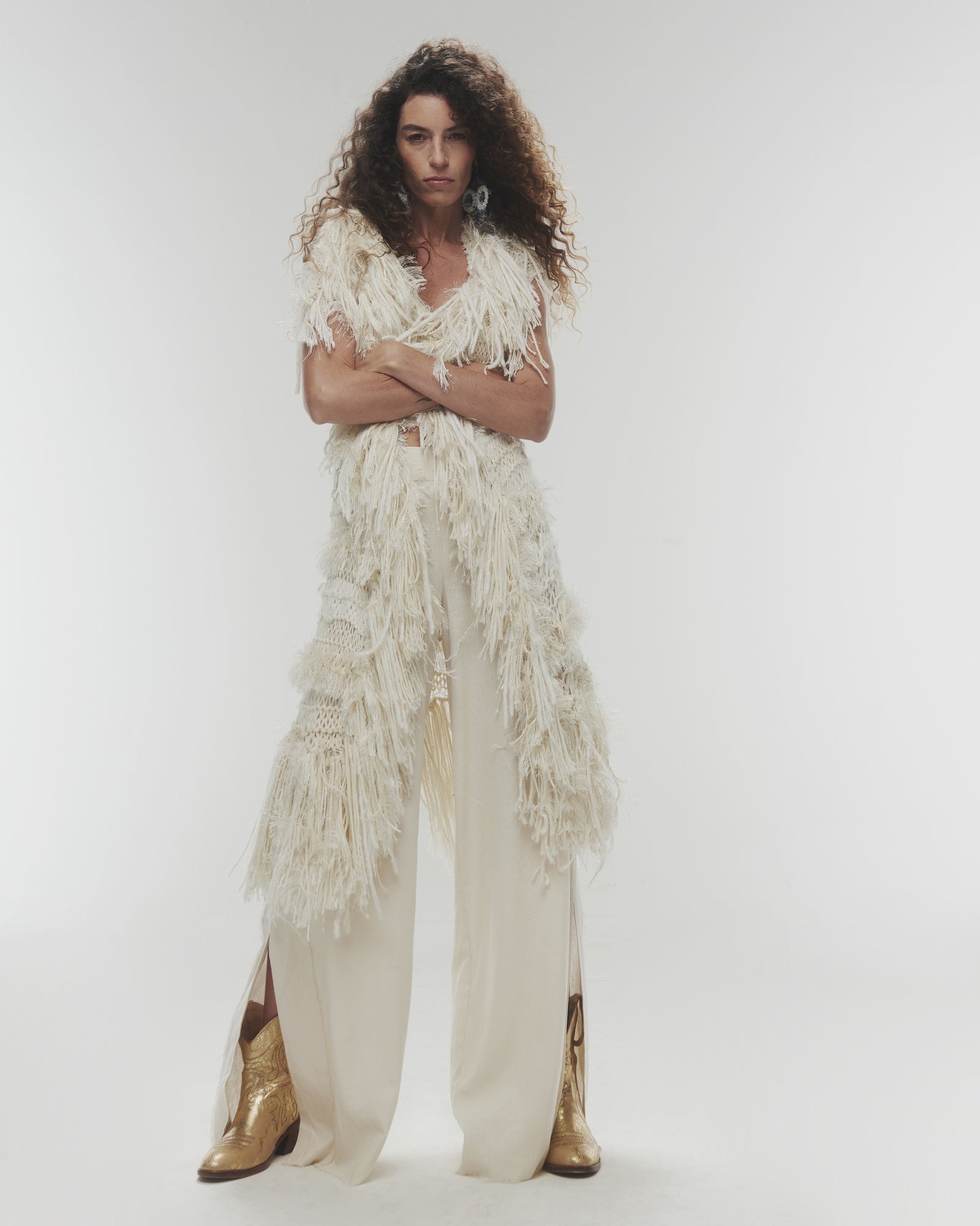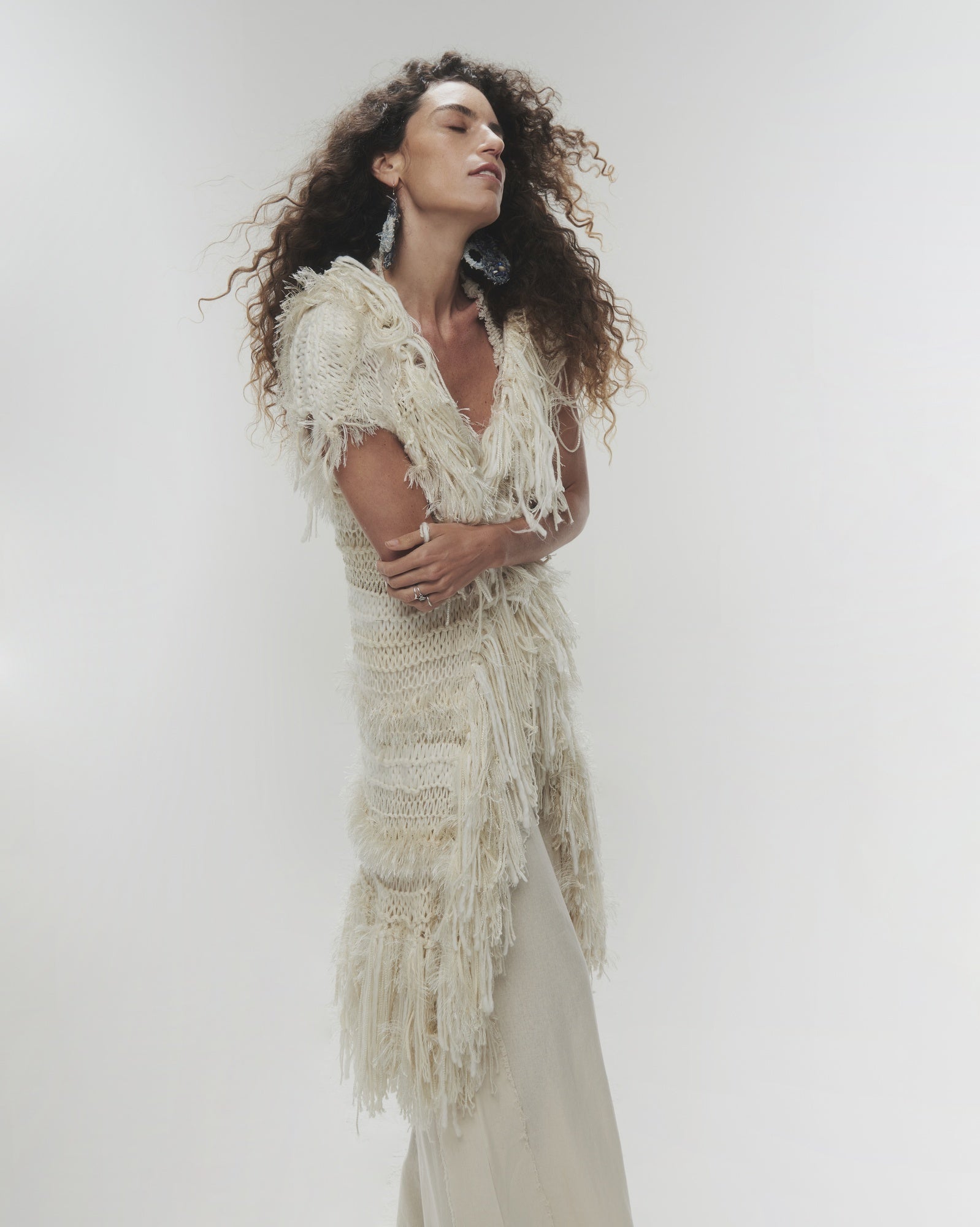Chaleco color blanco invierno, tejido a mano con una mezcla de distintas lanas, texturas y detalles en flecos.