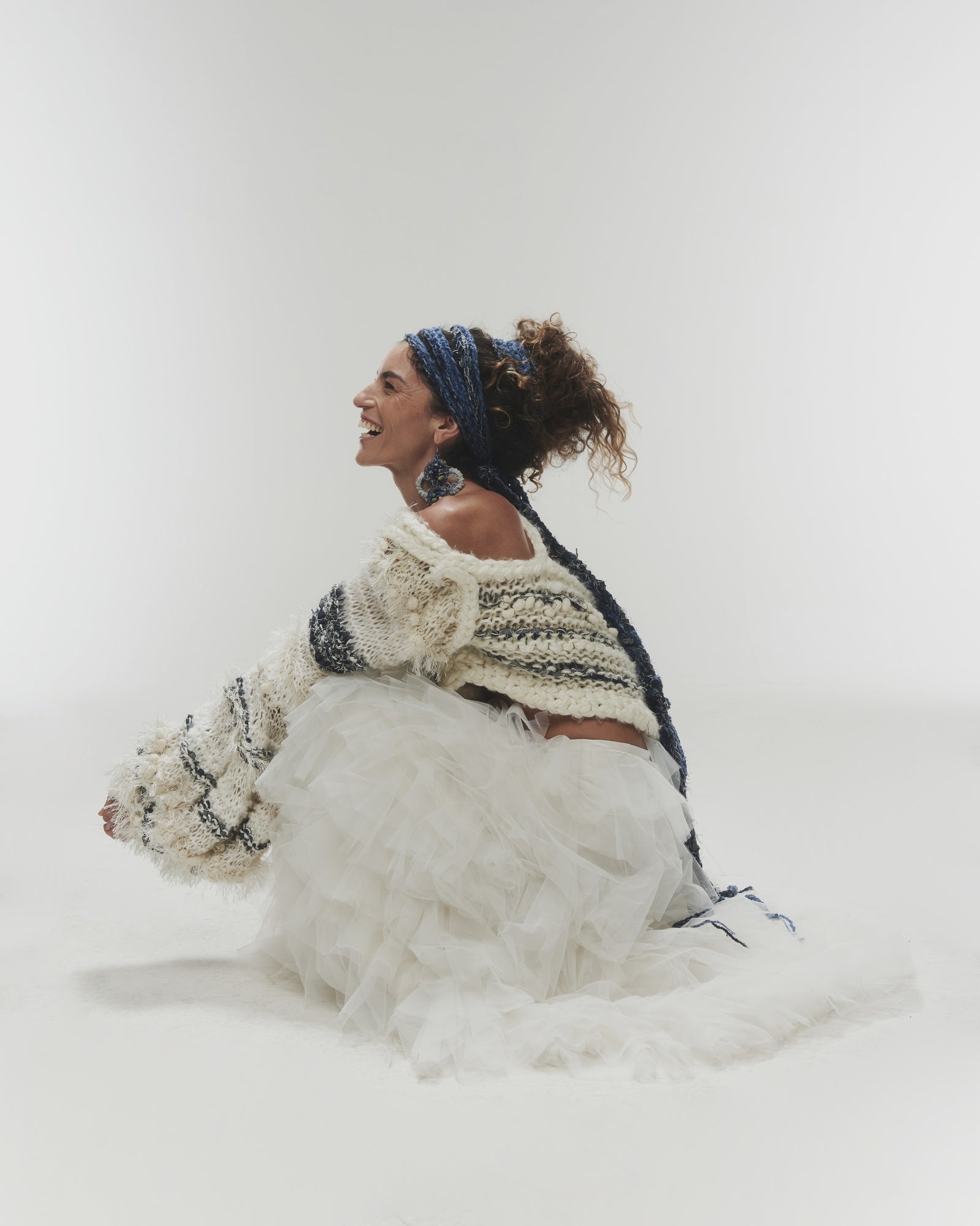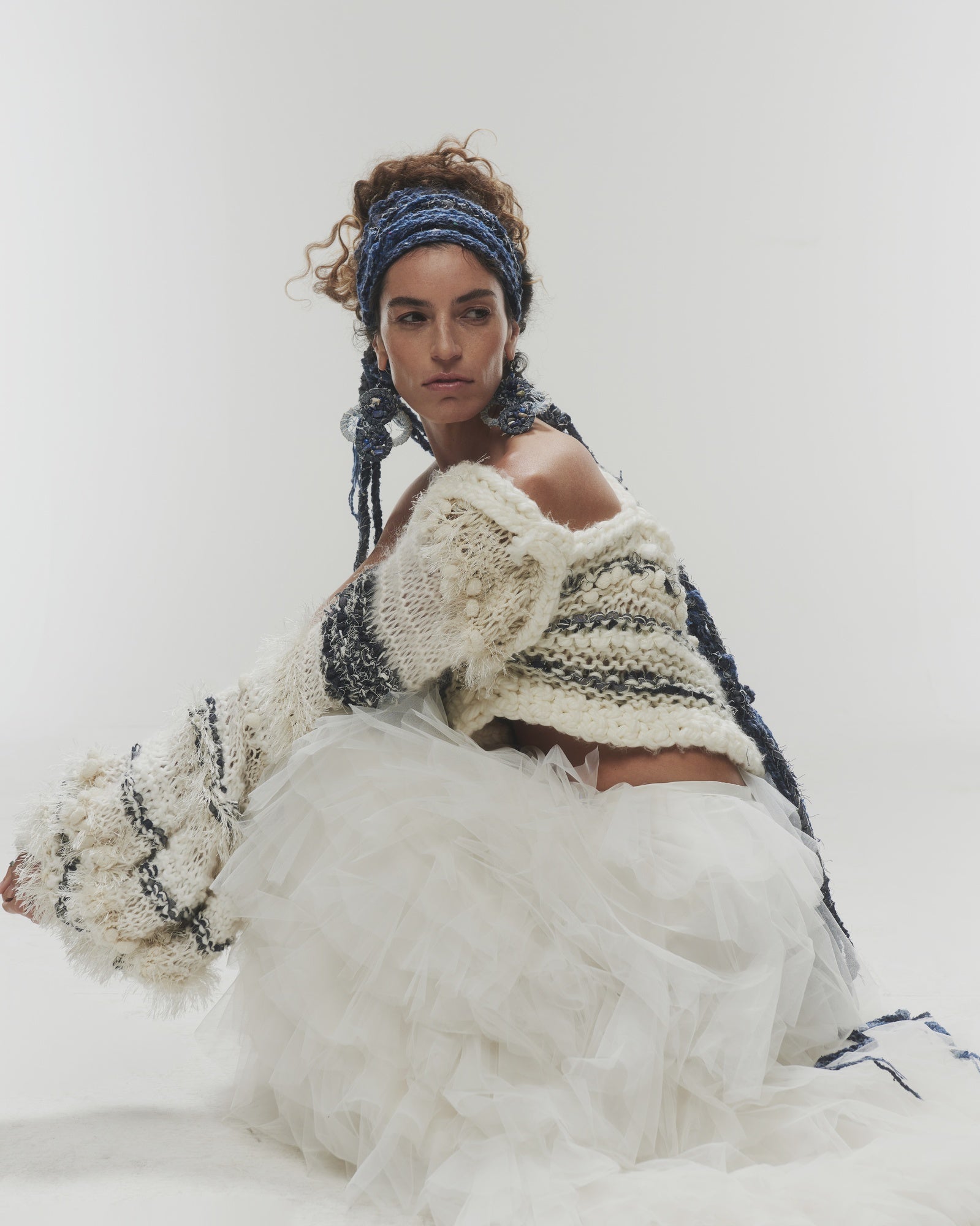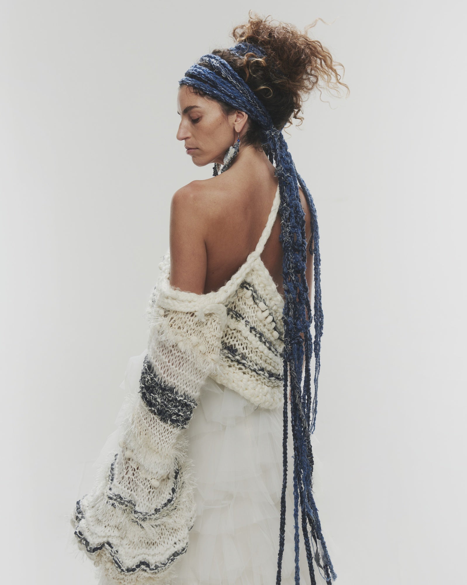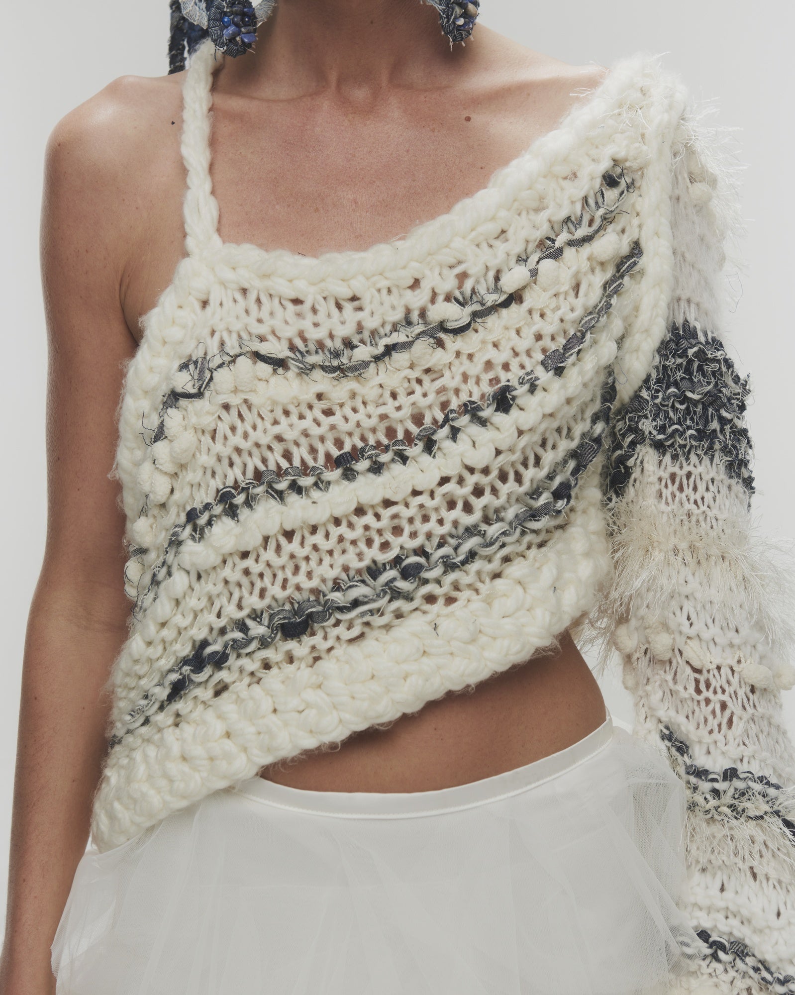 Chaleco tejido a mano de un solo hombro, confeccionado con una combinación única de distintas lanas y denim reciclado.
