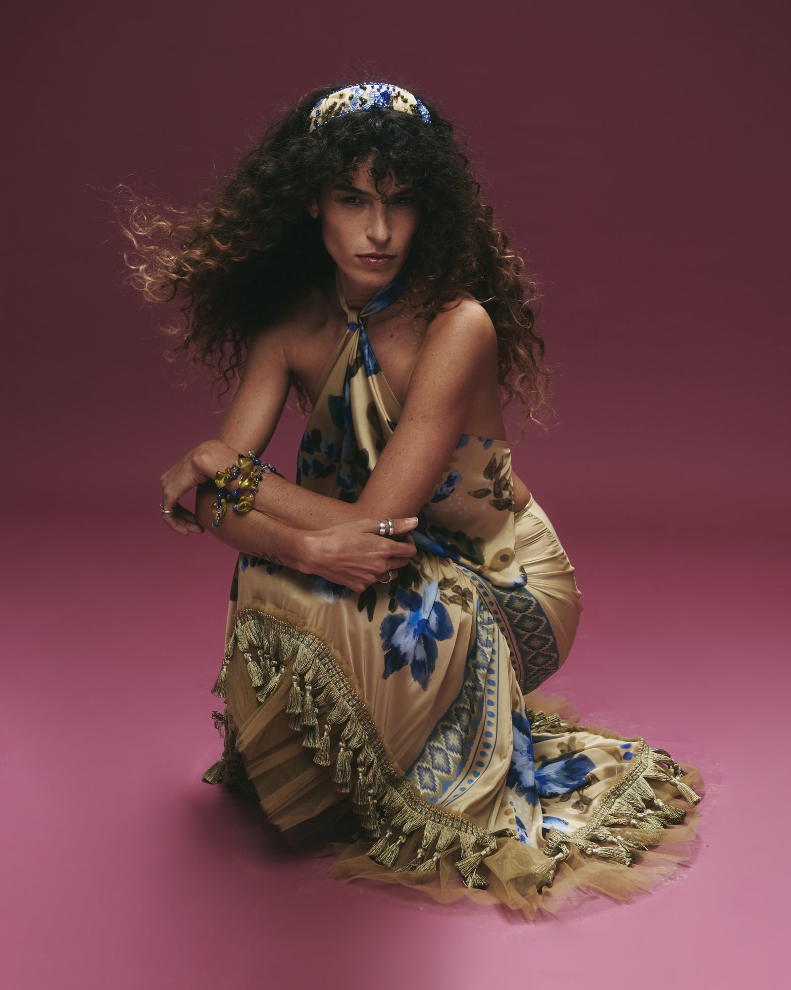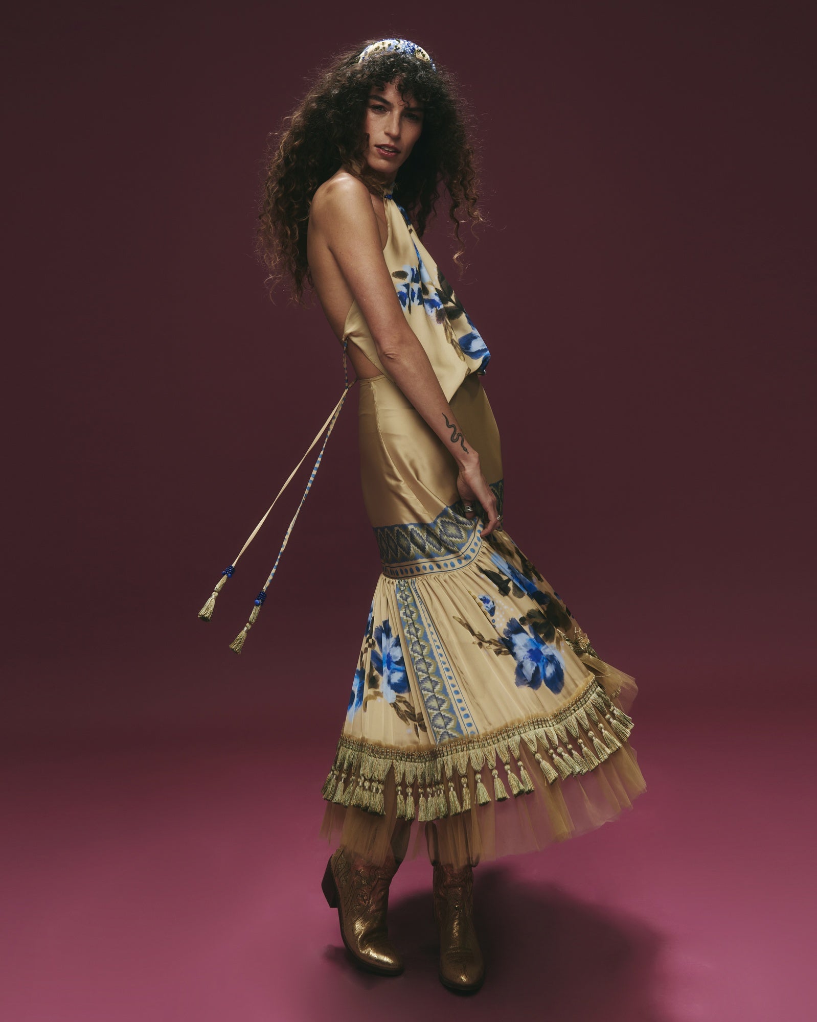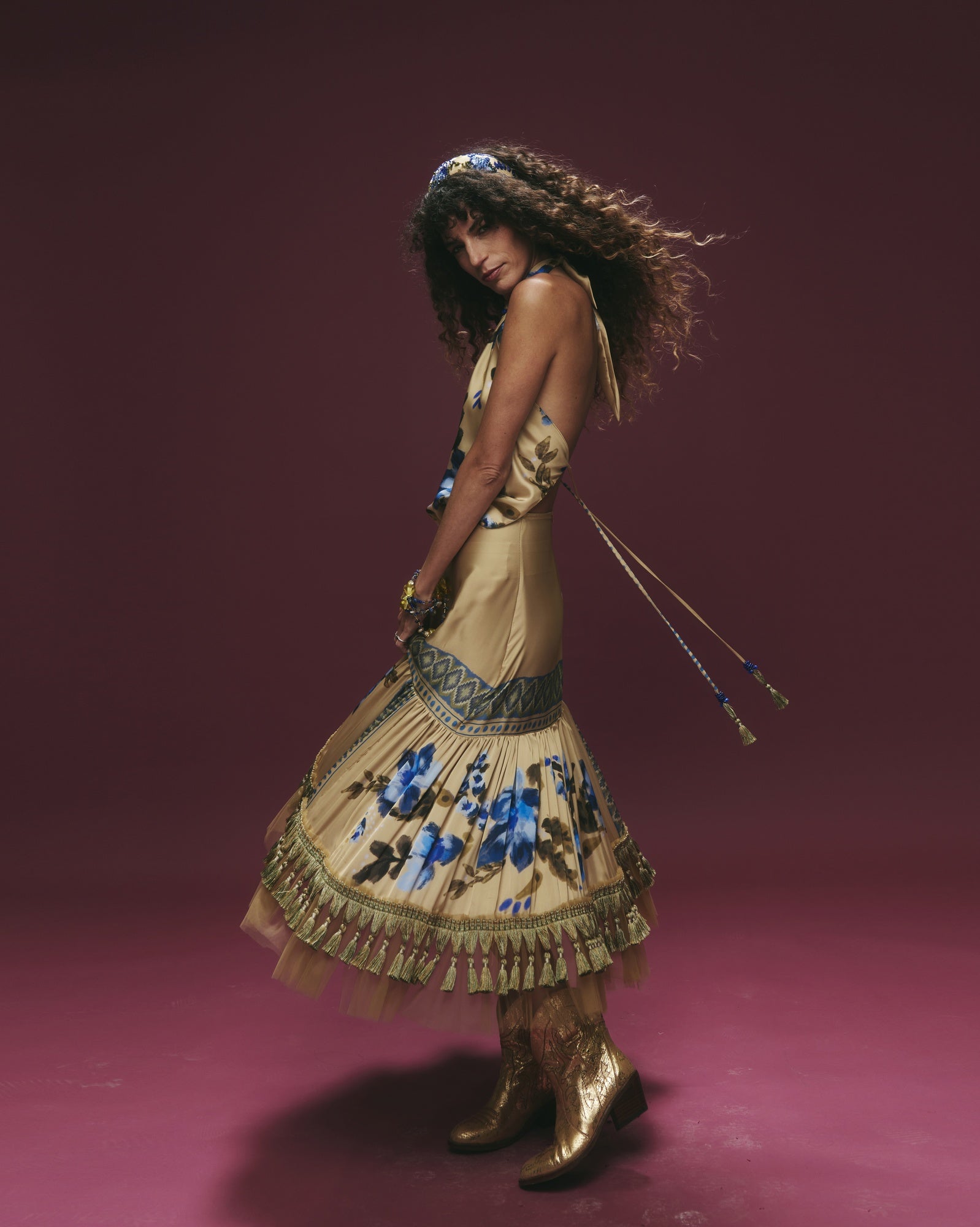 Conjunto de falda con flecos y top satinado con estampado floral. Textura tipo seda, suave y con un brillo elegante que realza el diseño.
