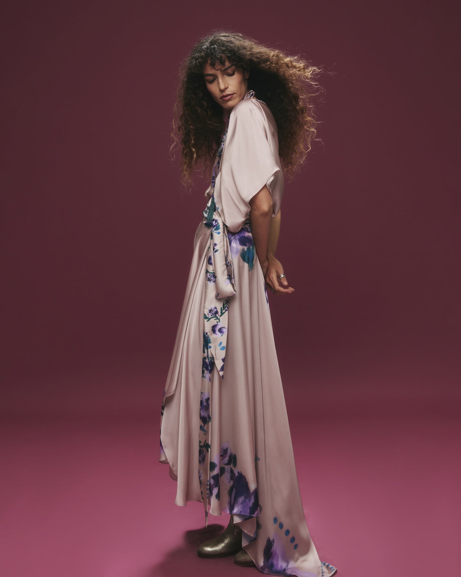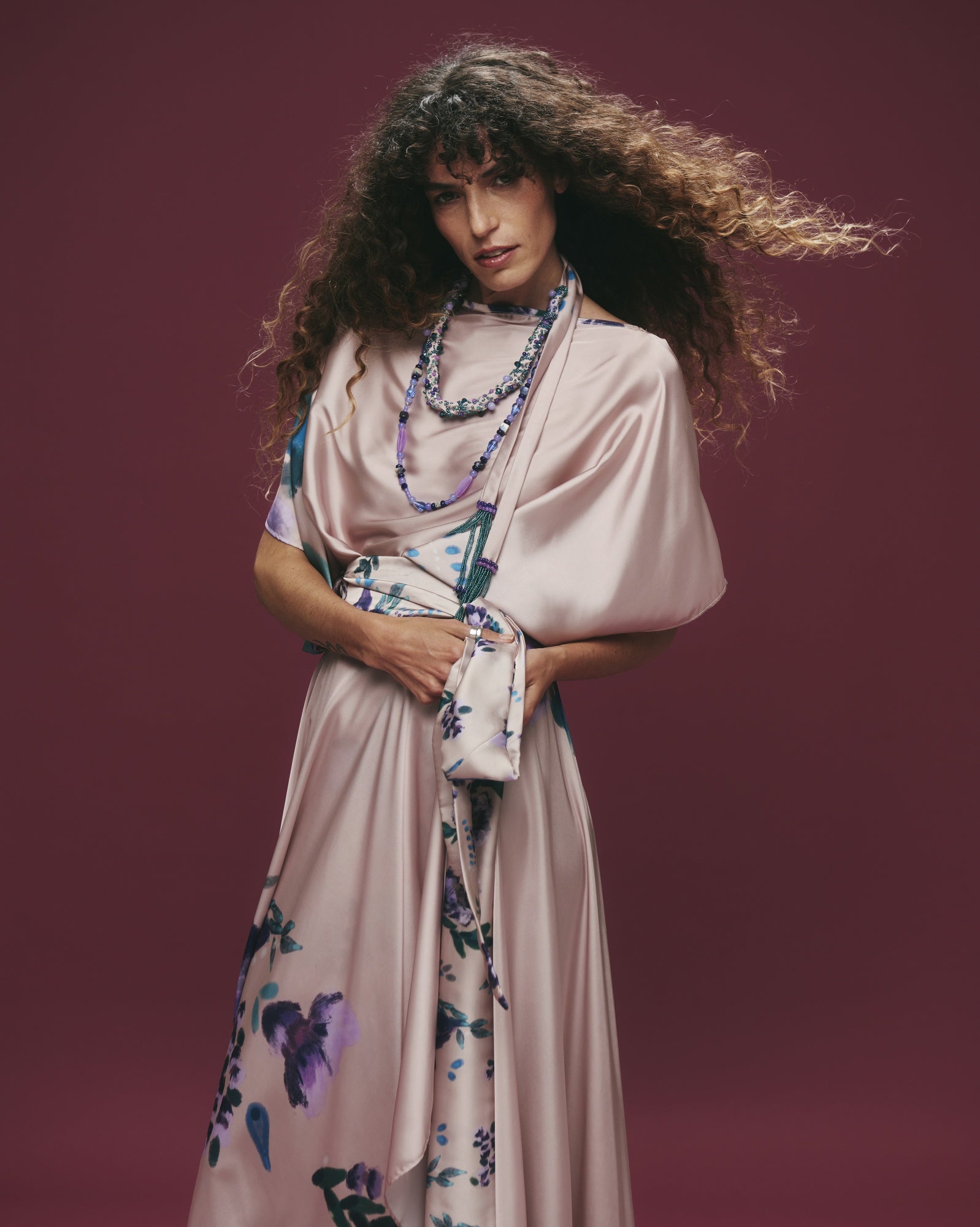 Su caída ligera y movimiento natural la convierten en una pieza elegante y llena de personalidad. El violeta, profundo y sofisticado, al mezclarse con rosados suaves y verdes frescos crea una paleta femenina, floral y delicada que evoca la frescura de un jardín en primavera, transmitiendo a la vez dulzura, vitalidad y un aire contemporáneo capaz de inspirar tanto en moda como en diseño y arte.