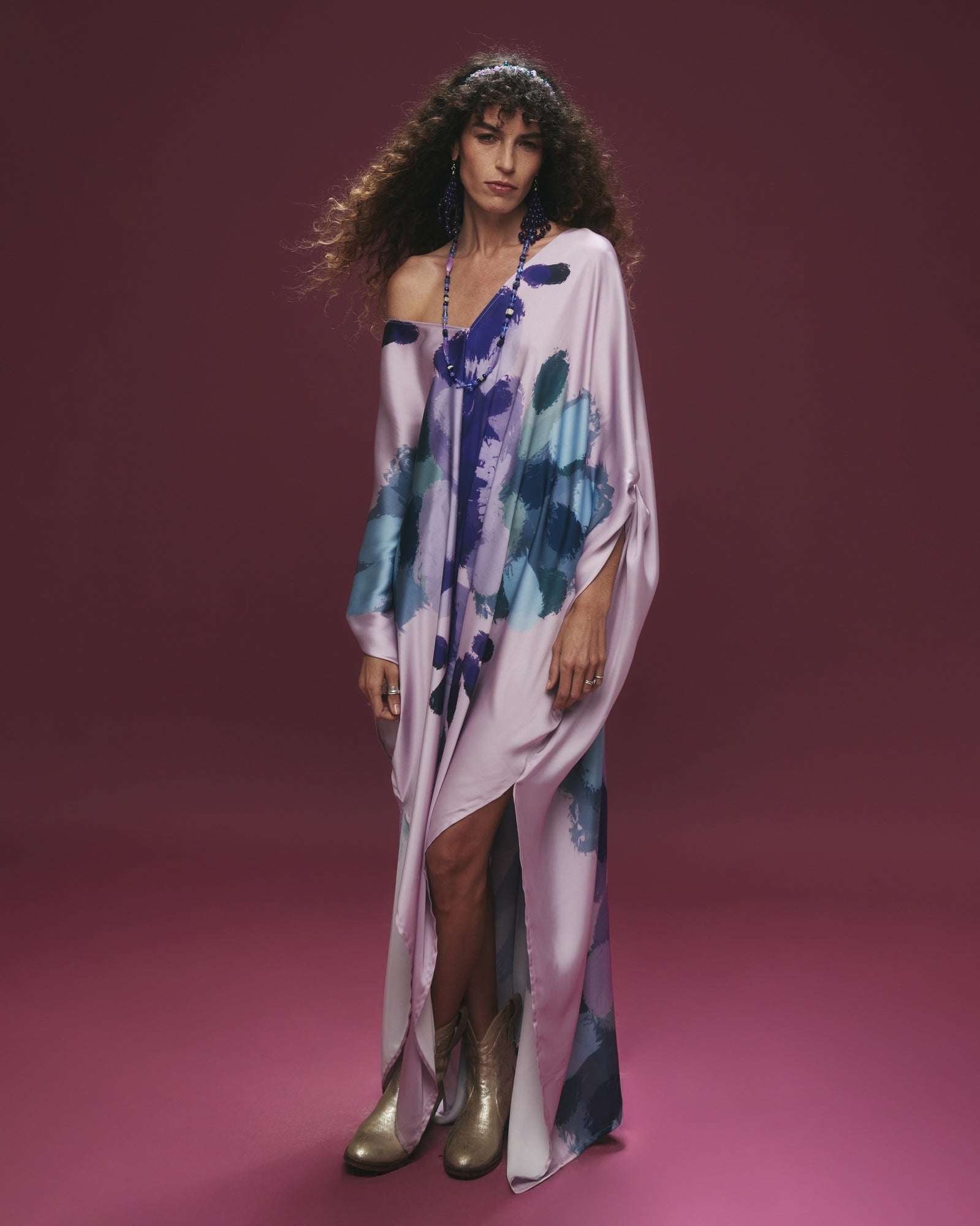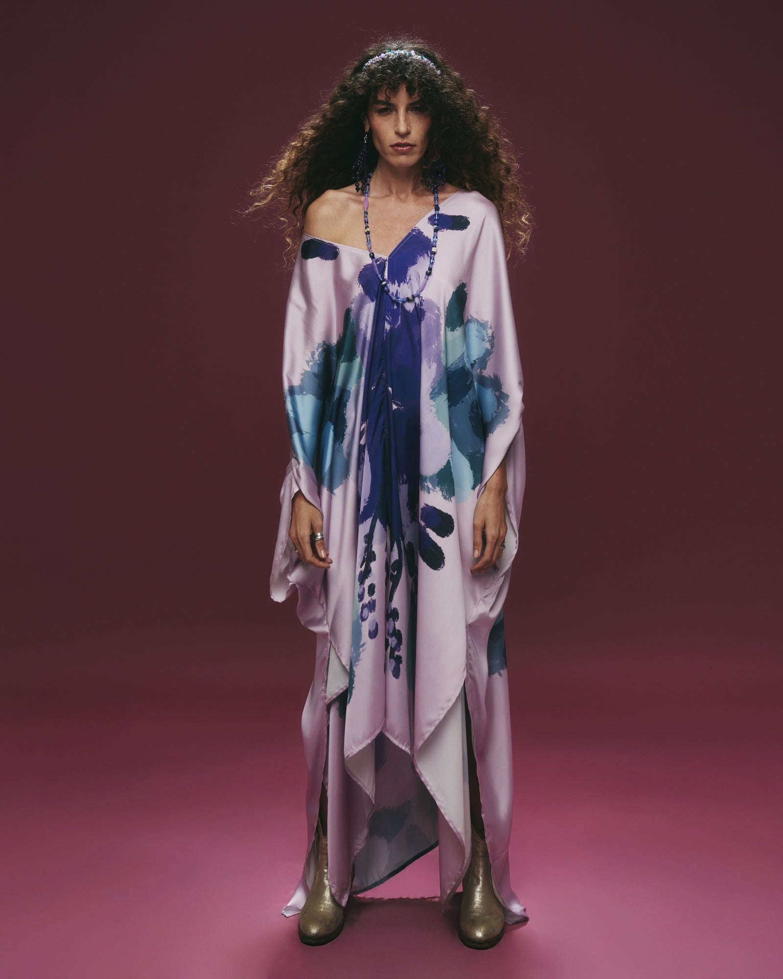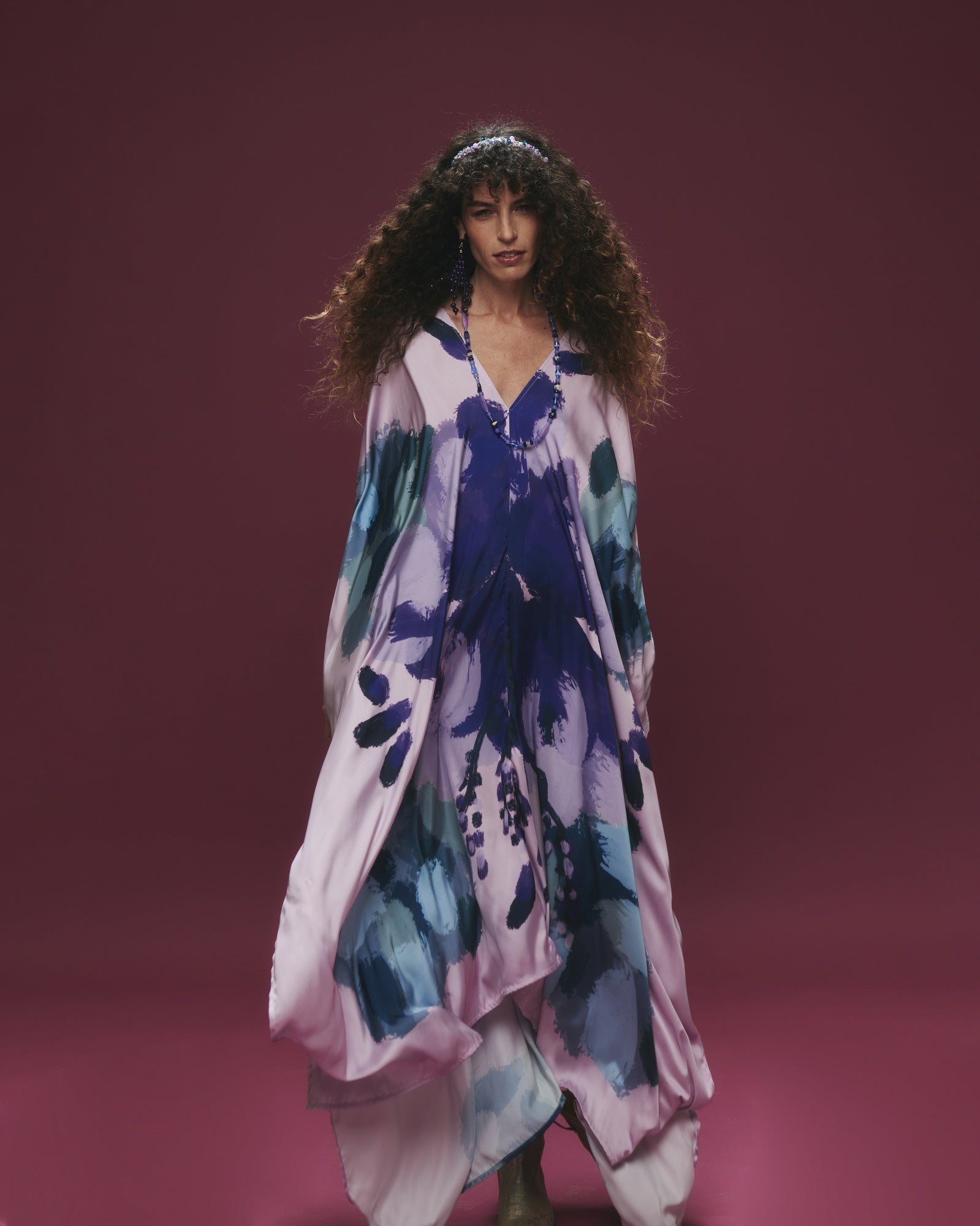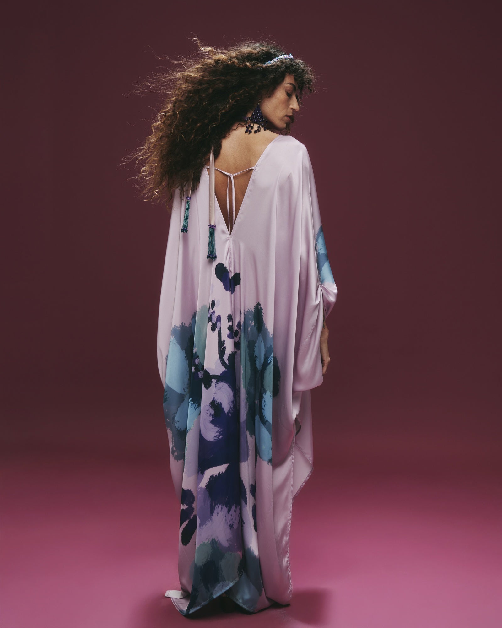 Túnica en satín sedoso color malva, estampada con ilustraciones florales en tonos morados y verdes. Amarra en la espalda y cuenta con detalles de mostacillas bordadas a mano.