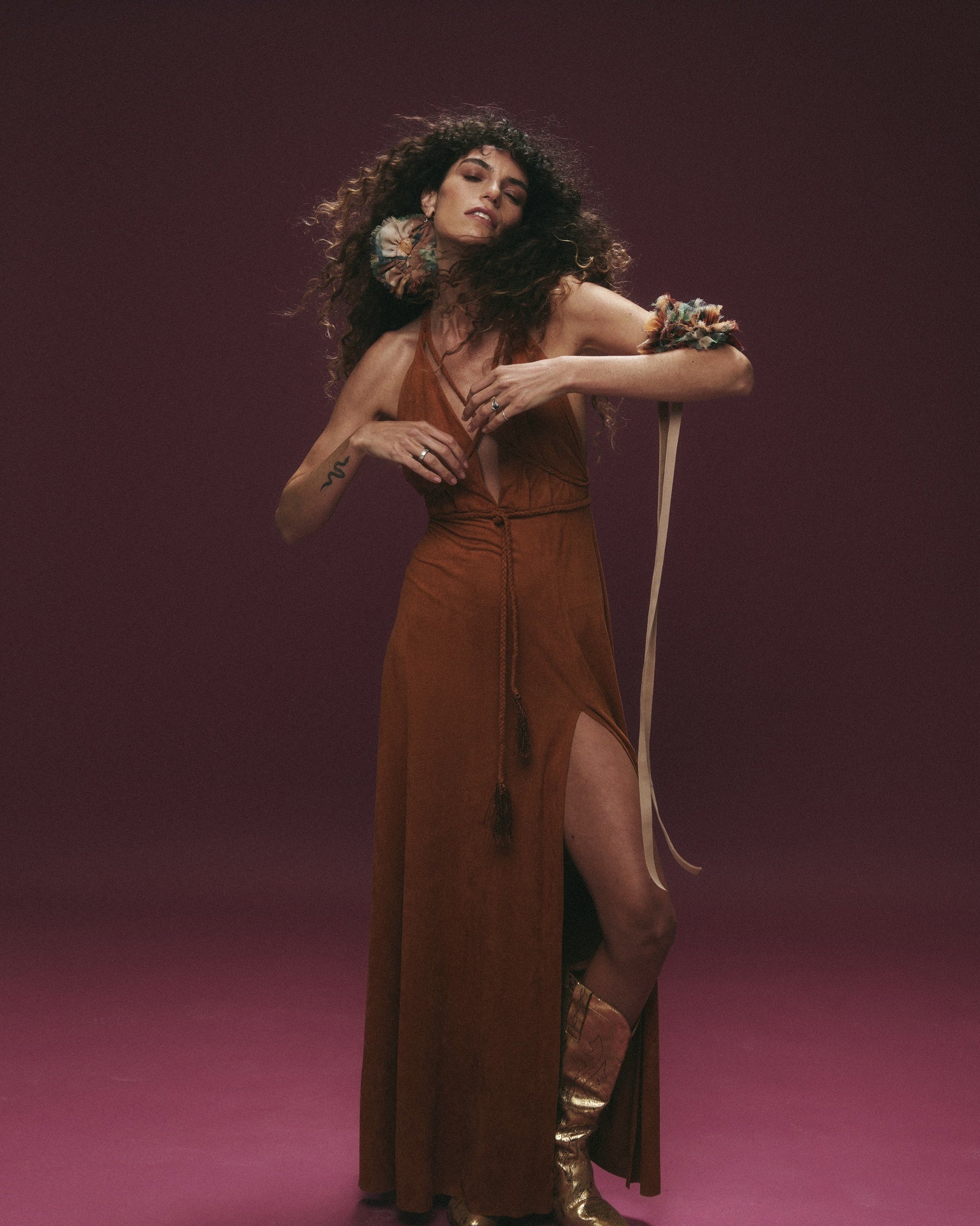 Vestido confeccionado en tela tipo gamuza, suave y con estructura ligera. Perfecto para un look cálido y elegante.